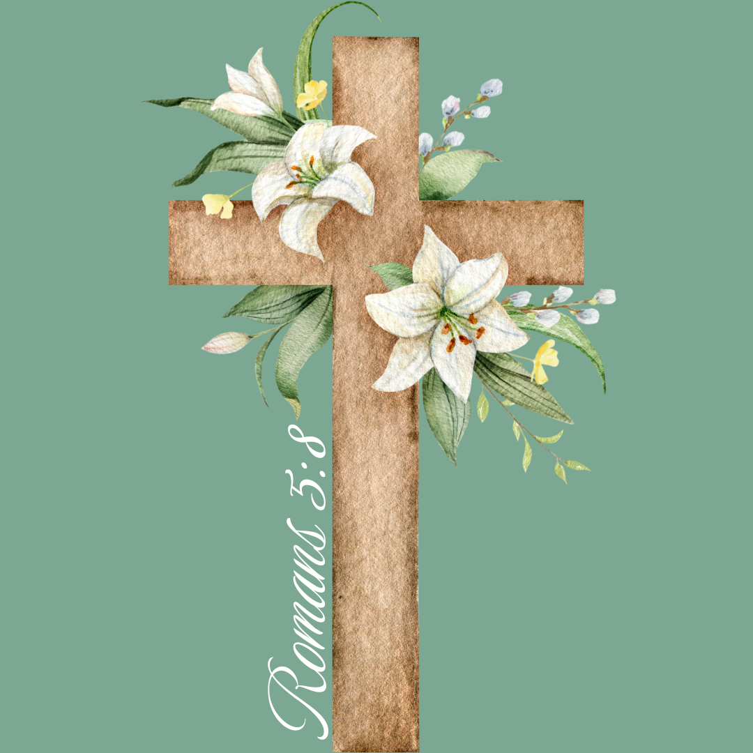 Women's Relaxed Fit T-shirt in Sage Green. Featuring a cross covered in white flowers and the verse Romans 5:8